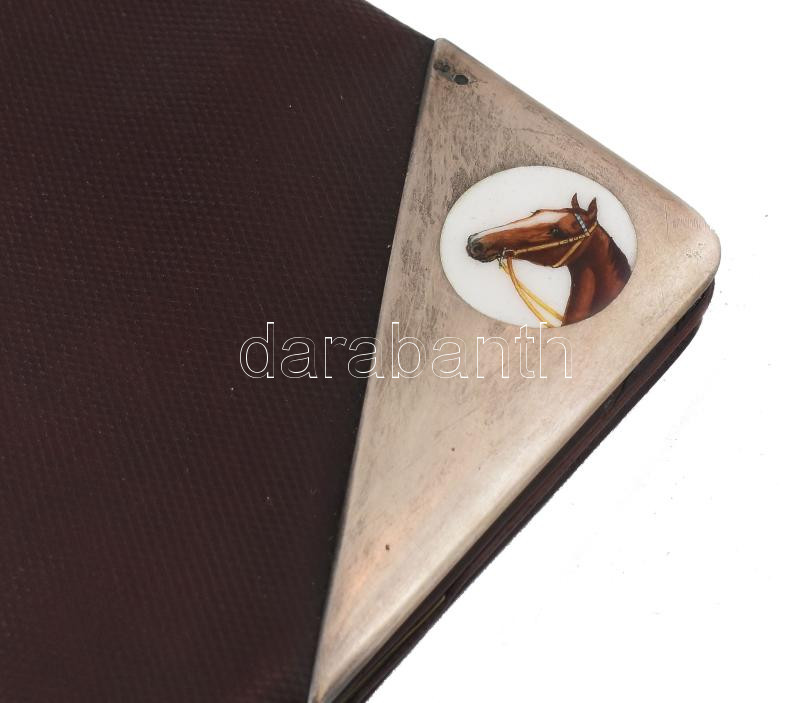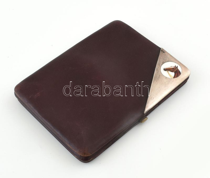 Ezüst (Ag) veretes bőr névjegytartó, zománcozott lófejes díszítménnyel...