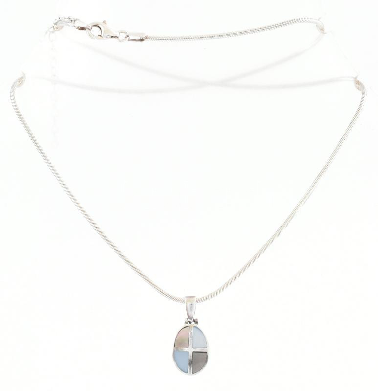 Ezüst(Ag) kígyó nyaklánc, gyöngyházas medállal, jelzett, h: 45-50 cm, 2×1 cm, bruttó: 8,2 g
