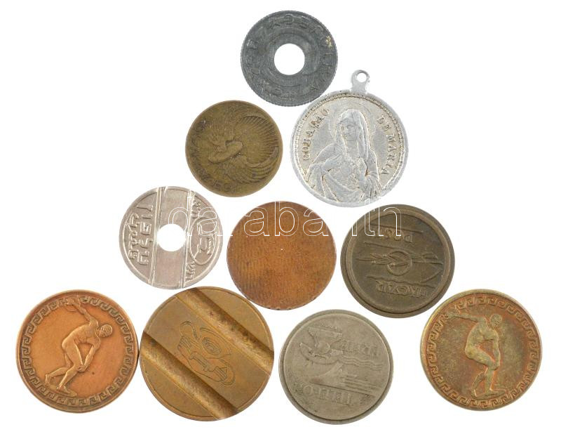 Description: 10db-os zseton és bárca tétel, közte "1933. BSZKRT / Kisszakasz jegy" sárgaréz közlekedési bárca + 1943. "BSZKRT Váltójegy" Zn közlekedési bárca + DN "Vidám park" bronz zseton + kétoldalas Al kegyérem füllel (21mm) + 1995. "104. Nemzetközi Olimpiai Bizottsági Ülés Budapest" angol és francia nyelvű Br emlékérem (22mm) (2db) T:2-3
