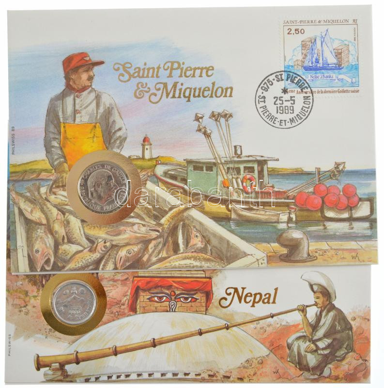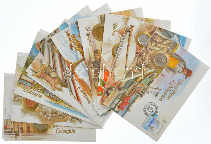 10db-os érmés boríték tétel, mind különféle és német nyelvű tájékoztatóval, benne: Saint Pierre és Miquelon, Nepál, Belize, Szingapúr, Tuvalu, Holland-Antillák, Venezuela, Kelet-Karibi Államok - Dominika, Ascension-sziget, Kolumbia T:1-2