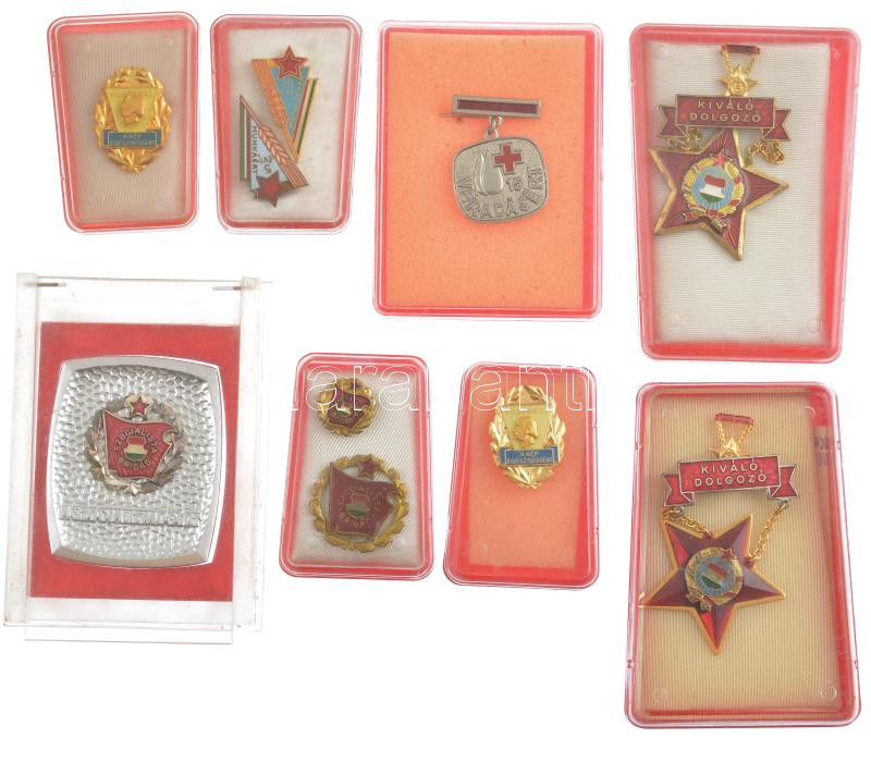 Description: ~1960-1970. 9db szocialista jelvény és emlékérem, közte "Hűséggel a nép egészségéért (2x), véradásért, 5-20 évi munkáért (2xklf), szocialista brigád (2xklf), kiváló dolgozó (2xklf)" mindegyik tokban T:2