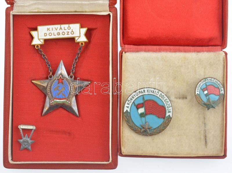 ~1960-1970. "A Könnyűipar Kiváló Dolgozója" zománcozott fém jelvény miniatűrrel, sötétebb kék színben, korai típus, eredeti tokban + ~1950. "Kiváló Dolgozó" Rákosi-címeres zománcozott fém kitüntetés miniatűrrel, eredeti tokban T:2 zománchiba, patina
