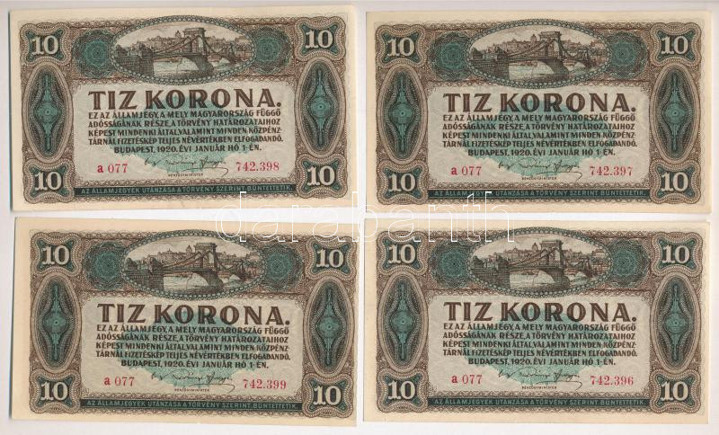 1920. 10K (4x) sorszámkövetők "a 077 742.396 - a 077 742.399" T:I-,II sarokhajlás, kis anyaghiány, beszakadás az alsó szegélynél