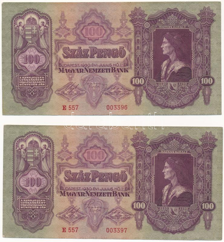 https://www.darabanth.com/en/429-Online-auction/429.0/Numismatics/Hungarian-Banknotes~2000009/1930-100P-4x-sorszamkovetok-E-557-003394-E-557-003397-TI-II-Adamo-P17~II2750948