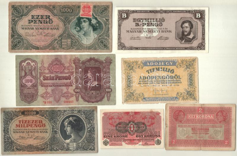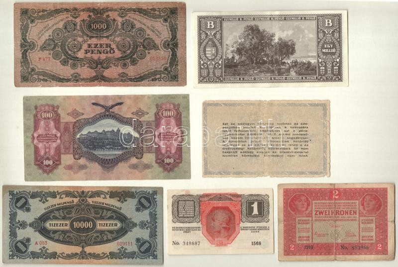 https://www.darabanth.com/en/429-Online-auction/429.0/Numismatics/Hungarian-Banknotes~2000009/7db-os-vegyes-bankjegy-tetel-kozte-korona-pengo-es-inflacios-pengo-TIII-III-kozte-folt-~II2750272
