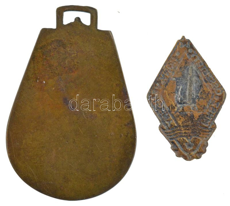Description: 1922. "A M. Kir. Honvédelmi Minister és a M. Kir. Honvédség főparancsnokának sportversenyérme. Alapíttatott: 1922" aranyozott bronz katonai díjérem (aranyozás lekopott) (45x30mm) + ~1960-1970. "MHSZ Összetett Honvédverseny" bronz lemezjelvény tű nélkül (29x18mm) T:2
