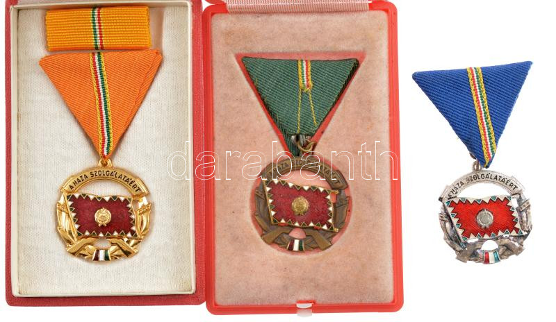 Description: 1964. "A Haza Szolgálatáért Érdemérem arany fokozat" zománcozott aranyozott bronz kitüntetés szalagsávval, tokban + "A Haza Szolgálatáért Érdemérem ezüst fokozat" zománcozott ezüstözött bronz kitüntetés + "A Haza Szolgálatáért Érdemérem bronz fokozat" zománcozott bronz kitüntetés sérült tokban T:1-,2