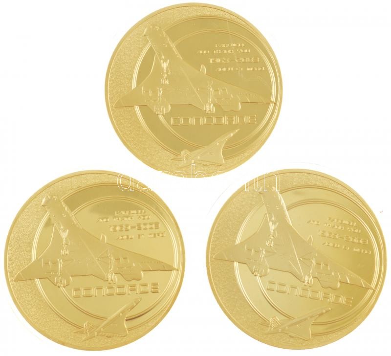 DN 3 darabos, mind különféle, a Concorde repülőgép típust ábrázoló aranyozott, részben multicolor festett emlékérem (70mm) T:PP kis fo.
