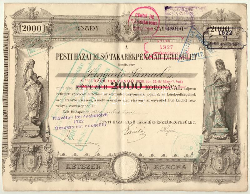 https://www.darabanth.com/en/429-Online-auction/429.0/Numismatics/Shares-and-Tickets~2000007/Budapest-1911-Pesti-Hazai-Elso-Takarekpenztar-Egyesulet-nevre-szolo-reszvenye-2000K-ro~II2753531