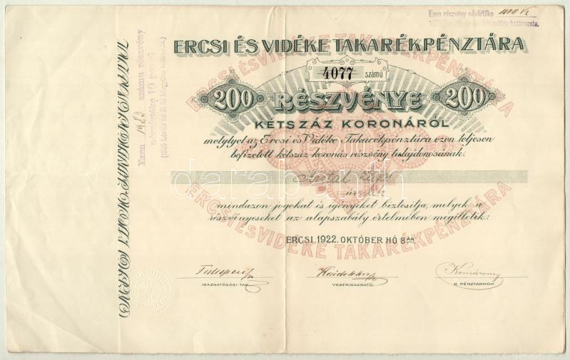 https://www.darabanth.com/en/429-Online-auction/429.0/Numismatics/Shares-and-Tickets~2000007/Ercsi-1922-Ercsi-es-Videke-Takarekpenztara-nevre-szolo-reszvenye-200K-rol-4077-sors~II2750157