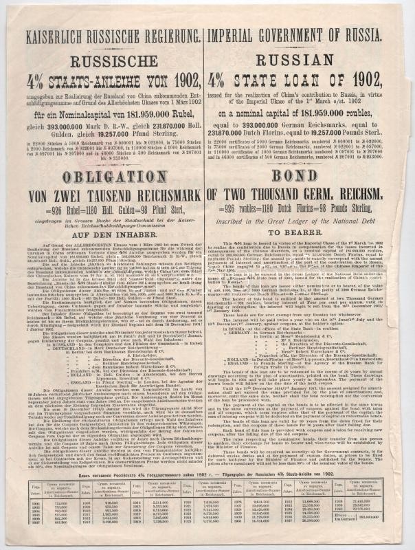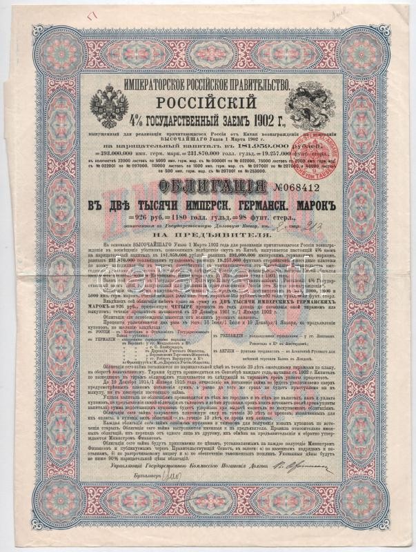 Russian Empire 1902. "Kaiserlich Russische Regierung. Russische 4% Staats-Anleihe von 1902" obligation about 2000 Marks, with "068412" serial number C:F