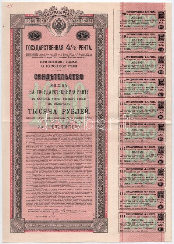 Description: Orosz Birodalom 1902. "Cári orosz 4%-os nyugdíj" elismervény 1000R-ről, szelvényekkel, "02395" sorszámmal T:III