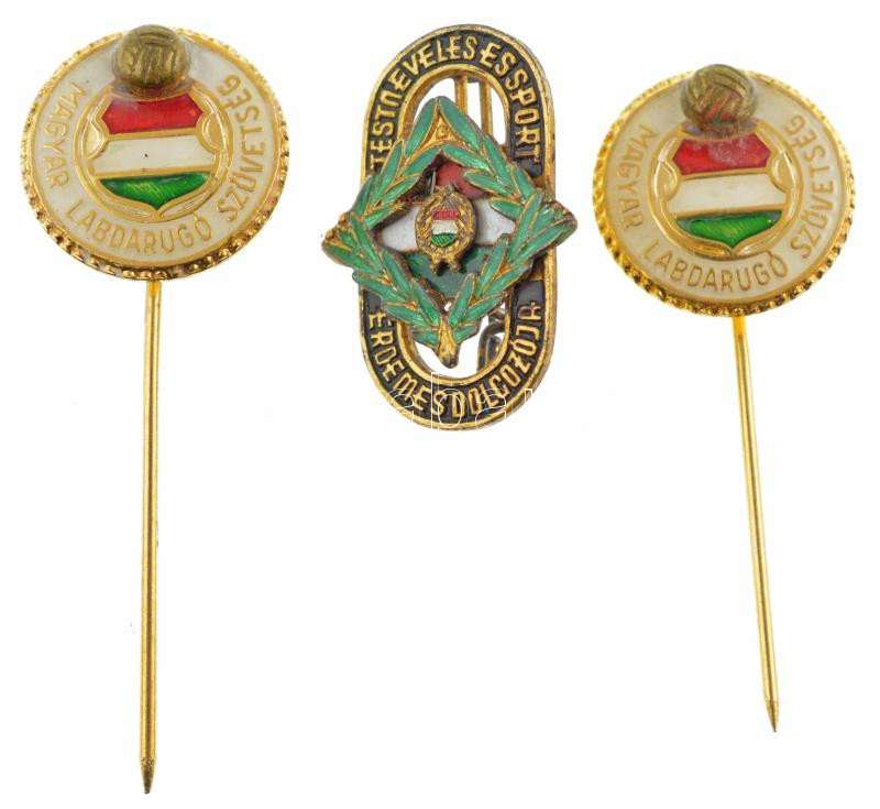 Description: ~1960. "Testnevelés és Sport Érdemes Dolgozója" aranyozott, zománcozott fém jelvény + DN "Magyar Labdarúgó Szövetség" zománcozott fém kitűző (2db) T:1-2