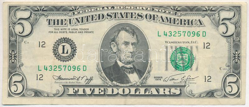 Amerikai Egyesült Államok 1974-1977. 5$ "L43257096D" "F... https://www.darabanth.com/en/429-Online-auction/429.0/Numismatics/Worldwide-banknotes~2000014/Amerikai-Egyesult-Allamok-1974-1977-5USD-L43257096D-Francine-Irving-Neff-William-E-Simon-TI~II2751925