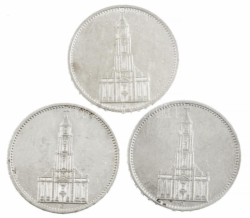 Description: Német Harmadik Birodalom 1935A/D/E 5M Ag "Náci hatalom első évfordulója / Potsdami Garrison templom" (3xklf) különböző verdejelek T:2 karc