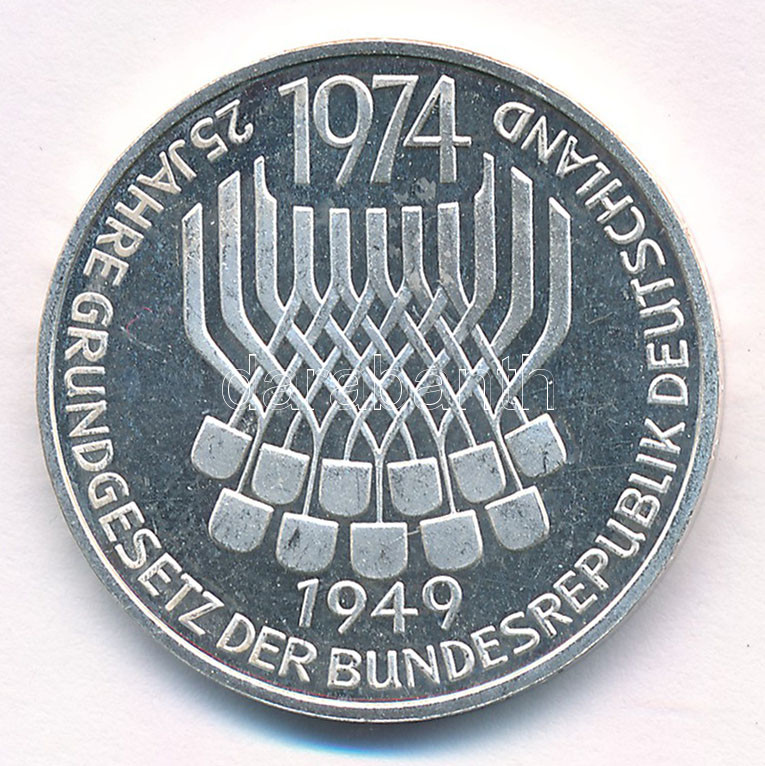 Német Szövetségi Köztársaság 1974F 5M Ag "25 éves az Alkotmány&qu... https://www.darabanth.com/en/429-Online-auction/429.0/Numismatics/Worldwide-silver-and-metal-coins~2000015/Nemet-Szovetsegi-Koztarsasag-1974F-5M-Ag-25-eves-az-Alkotmany-TPP-feluleti-karc--Federa~II2753154
