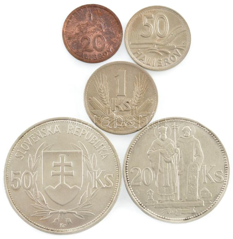 Szlovákia 1940. 20h bronz + 50h Cu-Ni + 1K Cu-Ni + 1941. 20K Ag "Cirill és Metód" + 1944. 50K Ag "Függetlenség 5. évfordulója" T:1-,2 patina, kis ph