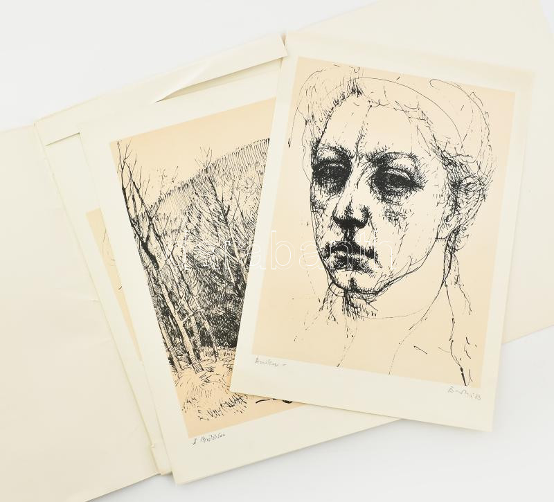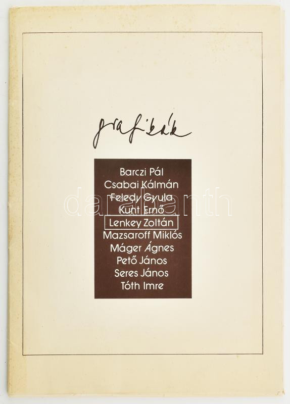 Grafikák Barczi Pál, Csabai Kálmán, Feledy Gyula, Kunt Ernő, Lenkey Zoltán, Mazsaroff Miklós, Máger Ágnes, Pető János, Seres János, Tóth Imre jelzett grafikáival. 30x42 cm