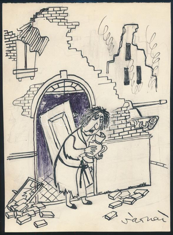 Description: Várnai György (1921-1991): Hát nem eltörték ezt a szép vázát, azzal a belövéssel... (1956). Tus, golyóstoll, papír, jelzett. Az Igazság c. lapban megjelent karikatúra, hátoldalán feliratozott. 21,5x15,5 cm.