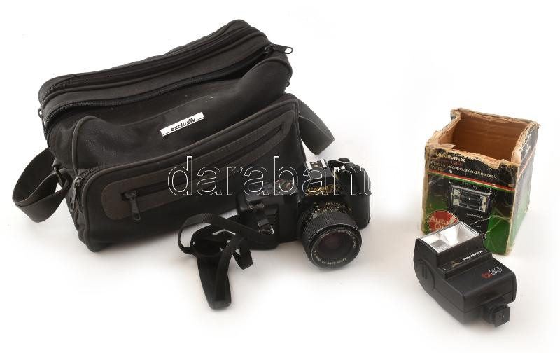 Canon T50 fényképezőgép, Hanimex vakuval, fellelt állapotban, táskával, nincs kipróbálva.