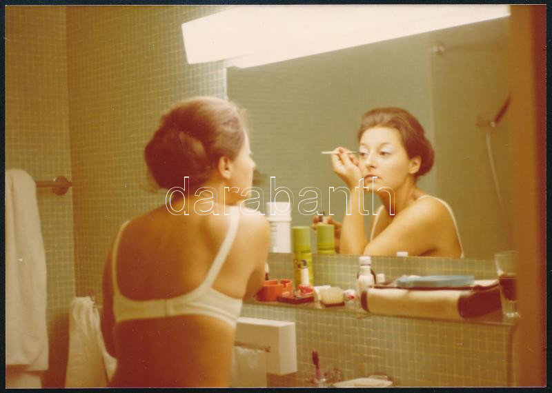 Reggeli készülődés, színes, jelzetlen amatőr fotó, vintage Kodak fotópapíron, 12,5x9 cm
