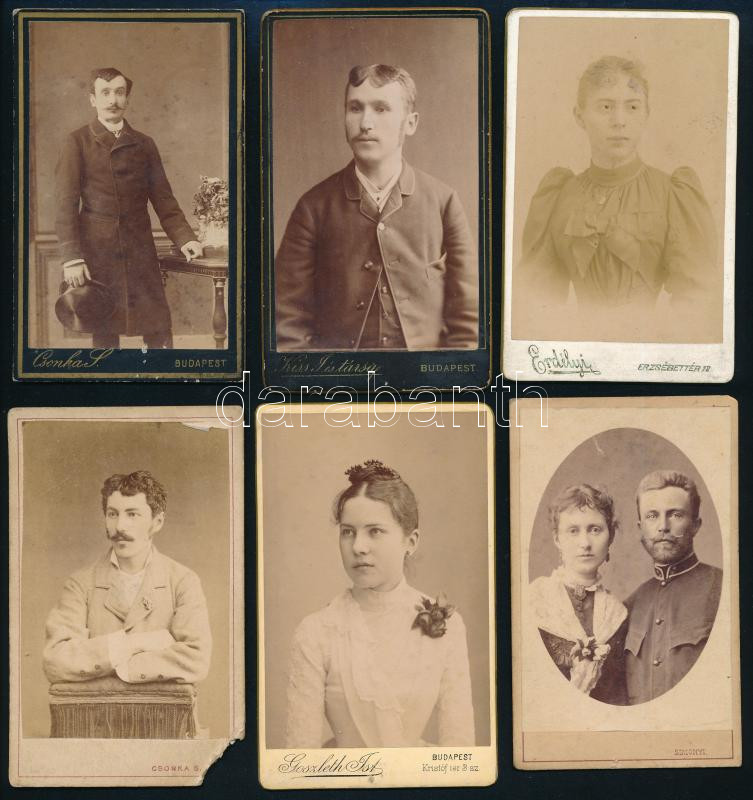 cca 1870-1890 össz. 16 db portré klf. pesti (Kozmata Ferenc) és budapesti műtermekből (Csonka Simon, Goszleth István, Simonyi, Erdélyi Mór, Kiss József és Társa, Stefanovits stb.), egyik sérült, keményhátú vintage fotók, kissé kopott, 8x4,5 és 10,5x6,5 cm közötti méretekben