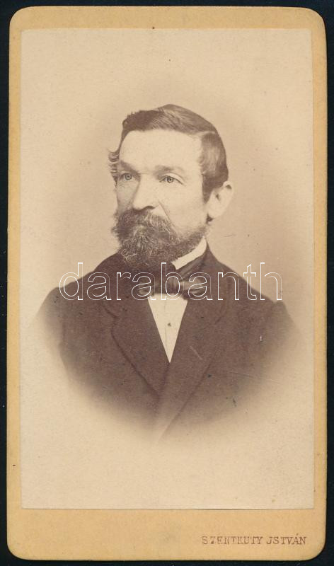 Description: cca 1871-80 Férfi portré, feltehetően a Thuróczy nemesi család vagy rokonságának tagja, keményhátú fotó Szentkuty István vegyész és fényképész pesti műterméből, hátoldalán autográf ajándékozási sorokkal (Thuróczy Klára kedves sógornőmnek emlékül, 1871 aug. 12), 10,5×6 cm,