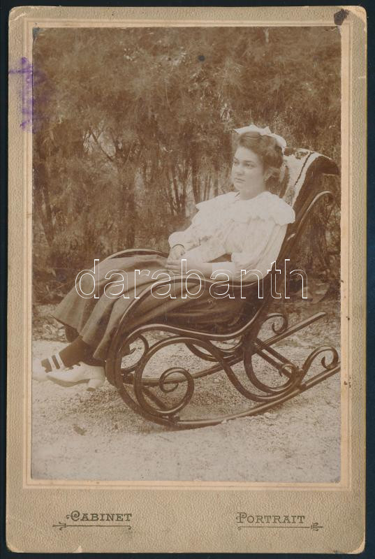cca 1900 Nő hintaszékben, keményhátú fotó, foltos, 16,5×10,5 cm