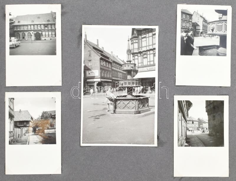 Description: cca 1930-1950 Régi fotók külföldi városokról, épületekről (Prága, Károly híd a Lőportoronnyal, Tyn-templom, stb.), összesen kb. 120-140 db fotó vegyesen, harántalakú zsinórfűzéses albumban, 35x25,5 cm