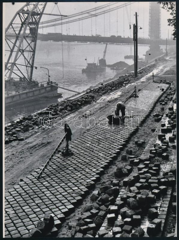 Description: cca 1964 Budapest, budai alsó rakpart, a háttérben épül az új Erzsébet híd, Sinka Antal (?-?) fényképész és fotóriporter hagyatékából 1 db mai nagyítás, 24x17,7 cm