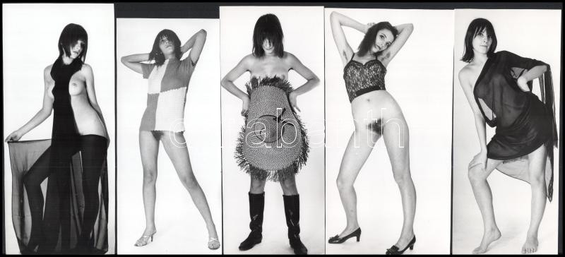 cca 1973 Tükör előtt próbálgatva, szolidan erotikus felvételek, 5 db vintage fotó ezüst zselatinos fotópapíron, 17,2x9 cm és 16,7x7,2 cm között