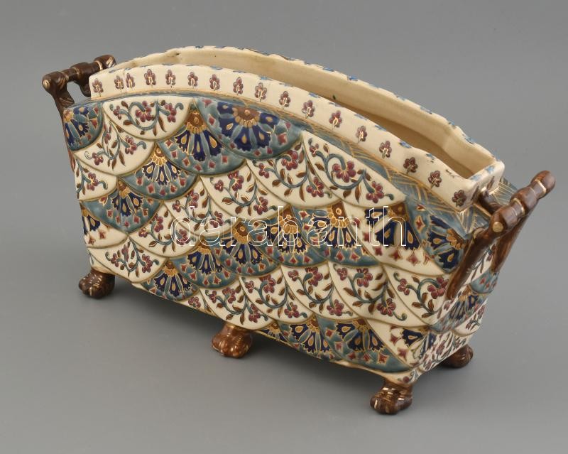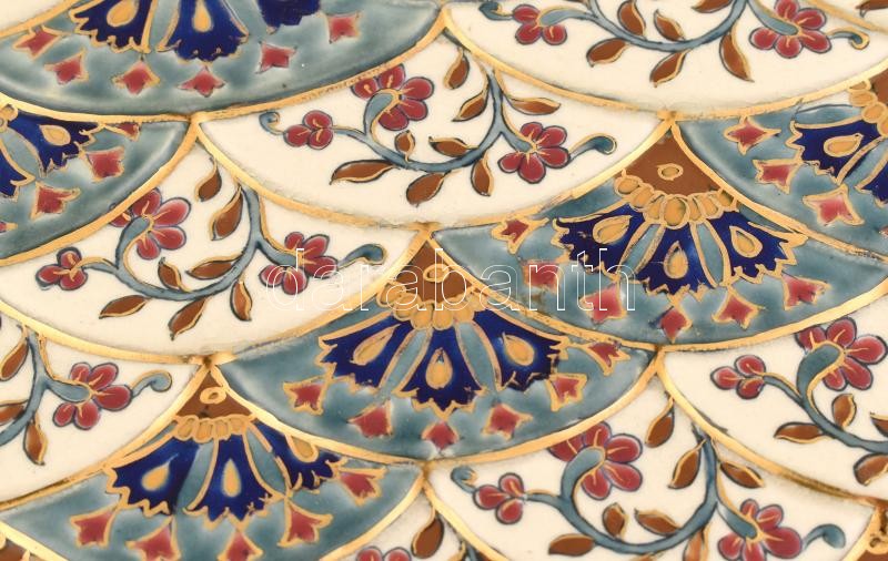 Fischer Ignácz Budapest, jardiniere, kézzel festett, aranyozott porcelánfajansz, jelzett "Fischer I. Budapest", füleinél restaurált, 42x11 cm, m:21 cm Fischer Ignác Herenden tanulta a mesterséget, majd a kiegyezés évében 1867-ben Pesten megalapította saját fazekas manufaktúráját. A fantázia nem ismer határokat, és Fischer rengeteg dekoratív műkerámiát készített, amelyeket nagy mennyiségben exportáltak. Sok darabja eljutott az Egyesült Államokba is. Ezek az árucikkek fantáziadús alkotások voltak, amelyek magyar díszítőmotívumokon alapultak, de közép-keleti és keleti mintákat is beépítettek. Fischer Ignác a magyarországi iparművészeti ismereteket édesapja tatai-tóvárosi kerámiagyárában szerezte. Ezt követően a szintén magyarországi herendi gyárban tökéletesítette és fejlesztette tovább kerámiaismereteit. Fische Ignác nem tartozik az eredeti herendi gyár második tulajdonosának, Farkasházi Fischer Móricnak a közvetlen leszármazottai közé. Fischer 1864-ben saját műhelyt alapított Pesten. Eleinte csak más gyárak porcelántermékeinek festésével foglalkozott. Saját kerámiákat azonban 1867-től kezdve gyártott. Zsolnayhoz hasonlóan Fischer is díszesen díszített kerámiák gyártására szakosodott. Elsősorban az Ausztria-Magyarországon értékesített és exportra is eladott majolikaedényeivel volt sikeres. Fischer kínai motívumokkal díszített darabokat is készített, amelyeket az 1885-ös magyar kiállításon értékesített. Számos jelentős díjat sikerült elnyernie. Végül fia, Emil vette át az üzletet. De 1885-re, Fischer Emil irányítása alatt a gyár lassan veszíteni kezdett a tekintélyéből, és végül Pécsett található Zsolnay Gyár tulajdonába került. Egyesek azt állítják, hogy Zsolnay azért vásárolta fel a Fischert, hogy a saját javára kiszorítsa őket az üzleti piacról.