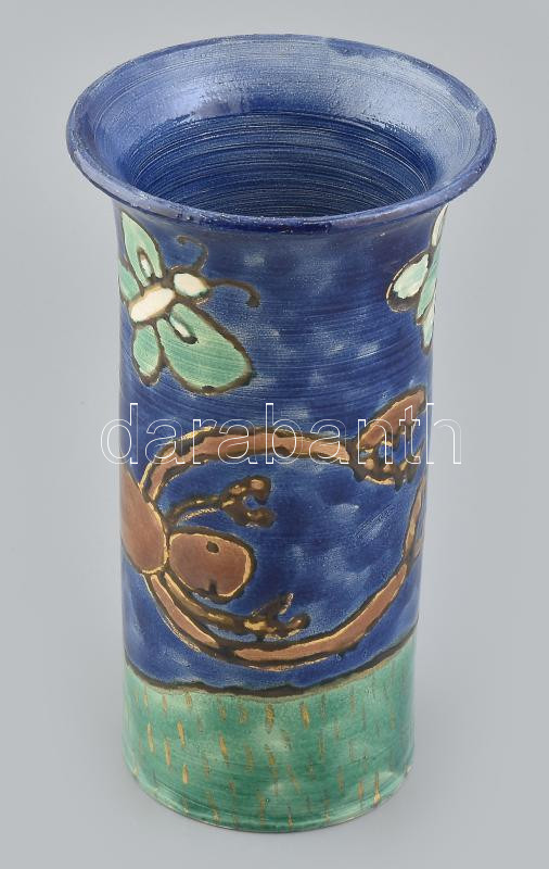 Gyerekrajzos váza, mázas kerámia, kézzel festett, jelzett, hibátlan, m...