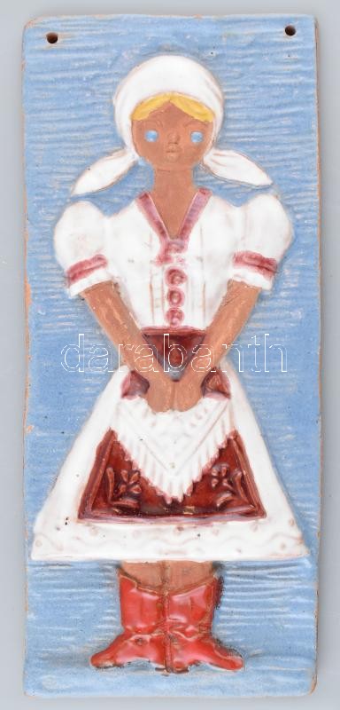 Richter jelzéssel: Népi ruhás kislány. Fali kerámia. 20X9 cm