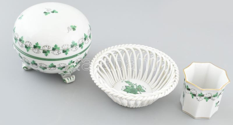 3 db Herendi porcelán: petrezselyemmintás lábas bonbonier (1943) + kis váza + zöld Apponyi mintás fonott tálka. Kézzel festett, jelzett, hibátlan / minimális kopással. d: 6 - 11,5 cm, m: 6 - 10,5 cm