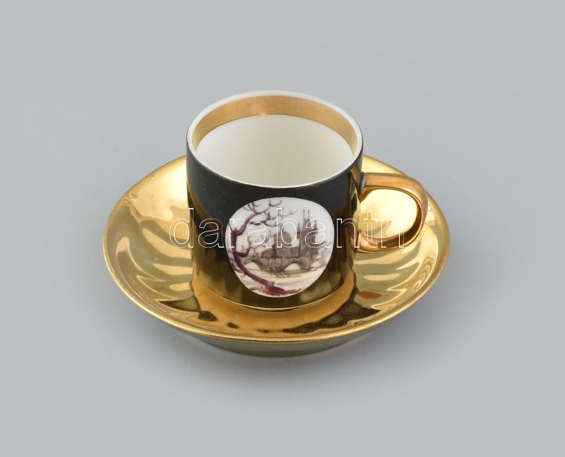 Prágai mokkás csésze, kézzel festett, jelzett, kopásnyomokkal.