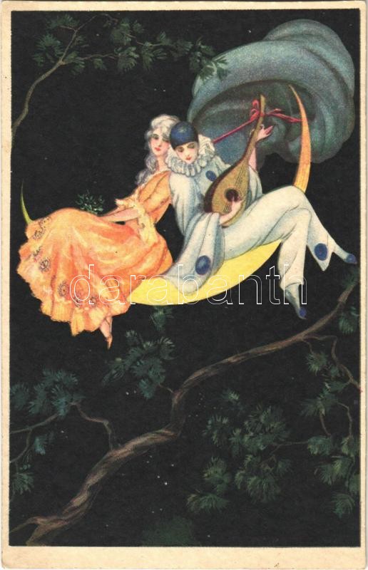 Bohóc és hölgy holdon / Pierrot and lady on moon. Italian art postcard...