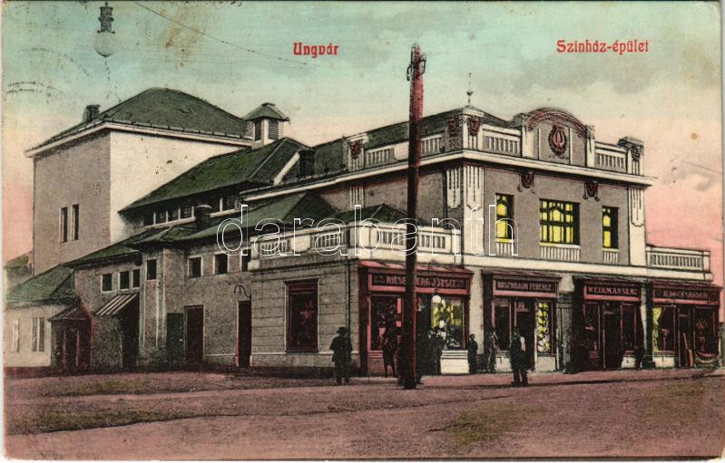 1909 Ungvár, Uzshorod, Uzhhorod, Uzhorod; Színház épület, Riesenberg József, Rosenbaum Ferenc, Weinman Samu, Klinger Sándor üzlete / theatre, shops (ázott sarkak / wet corners)