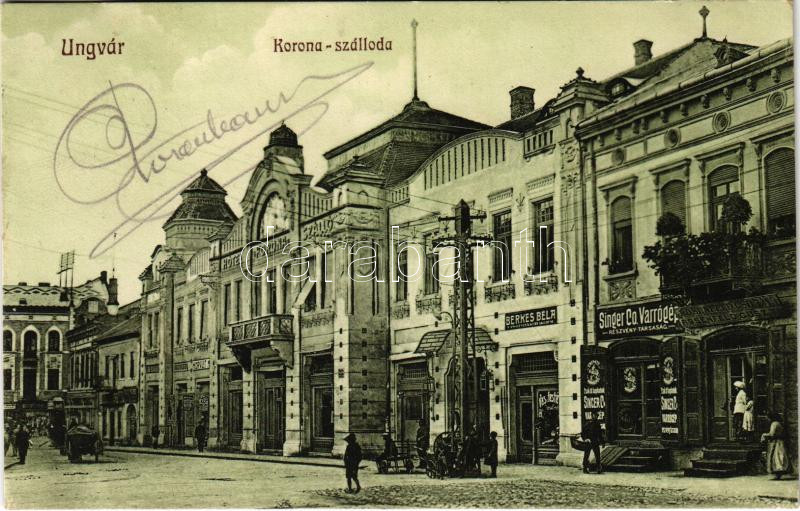 1914 Ungvár, Uzshorod, Uzhhorod, Uzhorod; Korona szálloda, Singer Co. Varrógép, Berkes Béla, Rosenfeld Guszti és Rosenfeld Csilla, Horvát M. üzlete. Székely és Illés kiadása / street view, hotel, shops (EK)