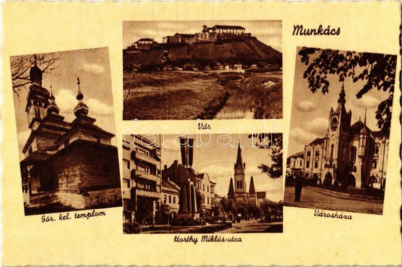 Munkács, Mukacheve, Mukacevo; Görög katolikus templom, vár, városháza, Horthy Miklós utca / Greek Catholic church, castle, town hall, street