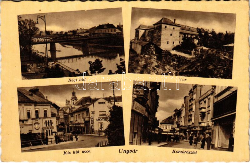 Ungvár, Uzshorod, Uzhhorod, Uzhorod; Régi híd, Kis Híd utca, Korzó részlet, vár, szálloda, garázs drogéria, cukrászda / bridge, street, hotel, garage, grudstore, confectionery (Rb)