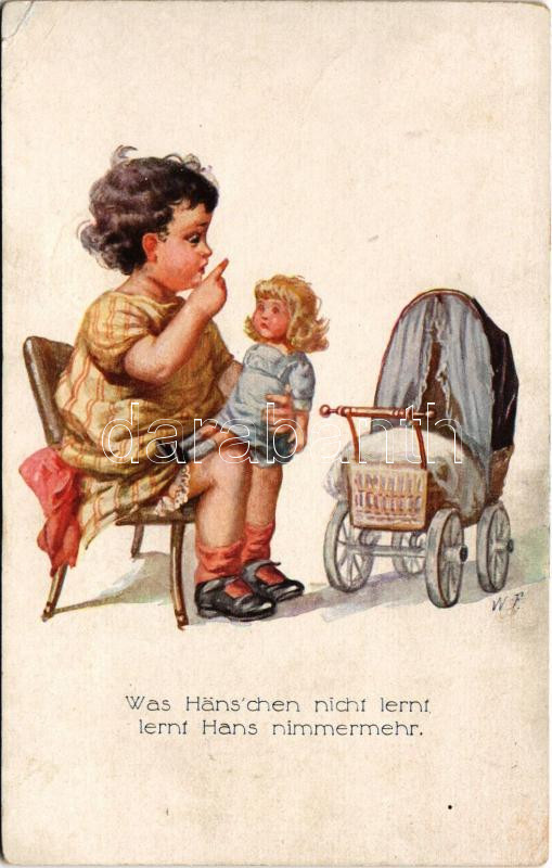 1917 Was Häns'chen nicht lernt, lernt Hans nimmermehr / Children art postcard, girl with doll. Hel. B. 522/3. s: W. F. (r)