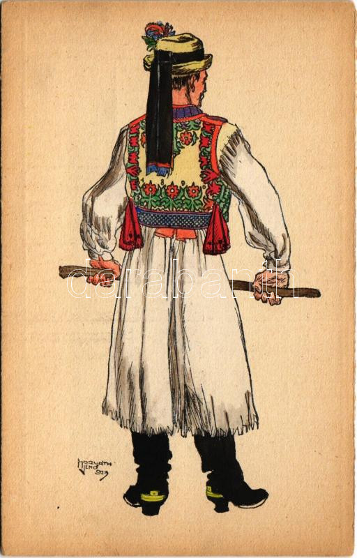 Description: Körösfő, Izvoru Crisului (Kalotaszeg, Tara Calatei); Kalotaszegi legény (Körösfő). Erdélyi folklór művészlap / Transylvanian folklore art postcard. Orbis Pictus Hungaricus. 4. s: Horváth Jenő