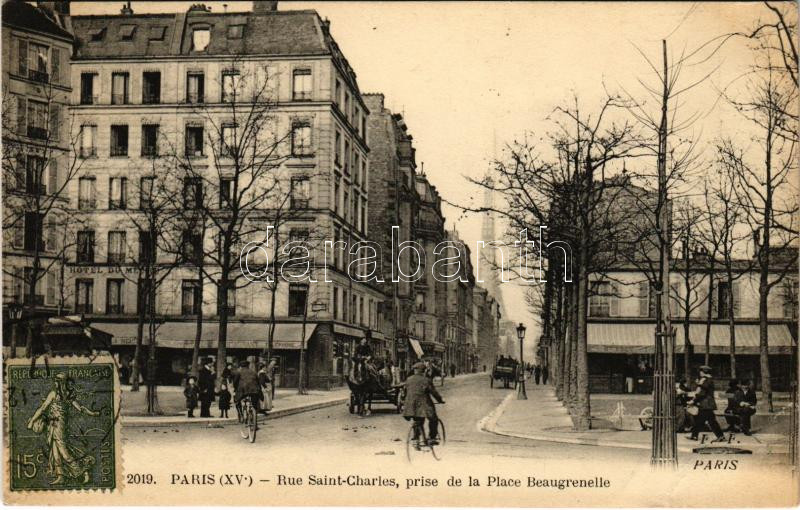 1917 Paris, Rue Saint-Charles, prise de la Place Beaugrenelle / street view, bicycle, hotel. TCV card (EB)