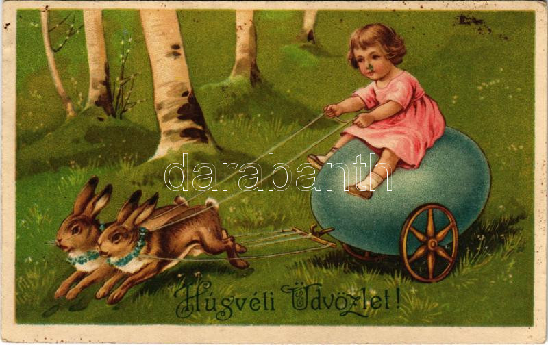 1927 Húsvéti üdvözlet / Easter greeting art postcard, rabbit-drawn egg. Amag No. 2146. litho (Rb)