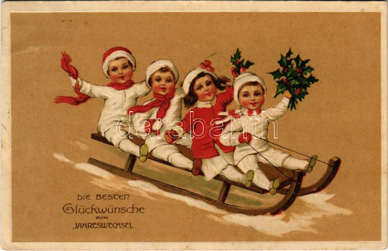 Die Besten Glückwünsche zum Jahreswechsel / Újévi üdvözlet, szánkózó gyerekek - dombornyomott / New Year greeting, sledding children. Embossed litho