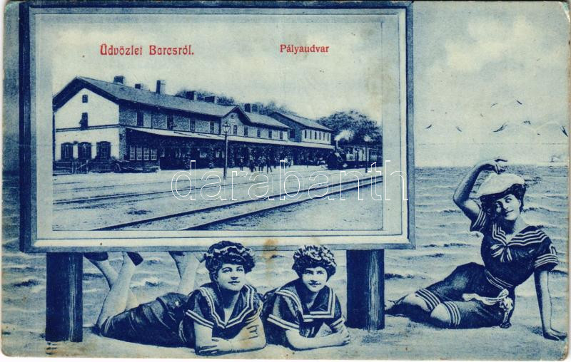 1911 Barcs, pályaudvar, vasútállomás, gőzmozdony, vonat. Montázs fürdőruhás hölgyekkel (fa)