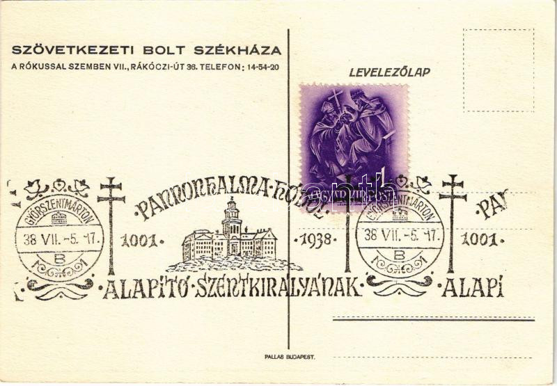 Description: 1938 Budapest VII. Szövetkezeti Bolt székháza a Rókus kórházzal szemben, reklámlap. Rákóczi út 38. s: Kanizsai + "1938 Pannonhalmáról Alapító Szentkirályának" So. Stpl