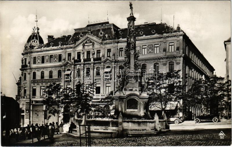 Pécs, Széchenyi tér, Szentháromság szobor, autók, Takarékpénztár, Duná...