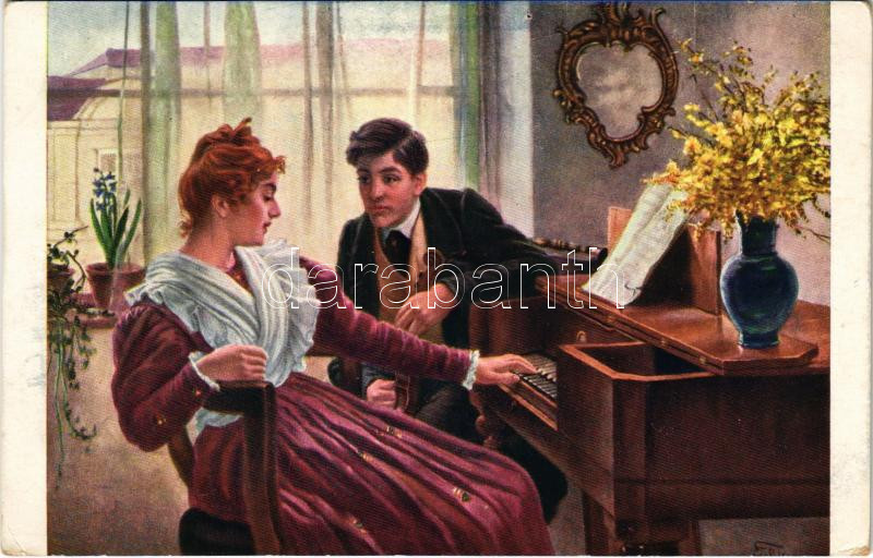Der Anfang eines Romanes / Lady art postcard, couple in love, piano. J.P.P. 1048. s: C. Zewy (EK)